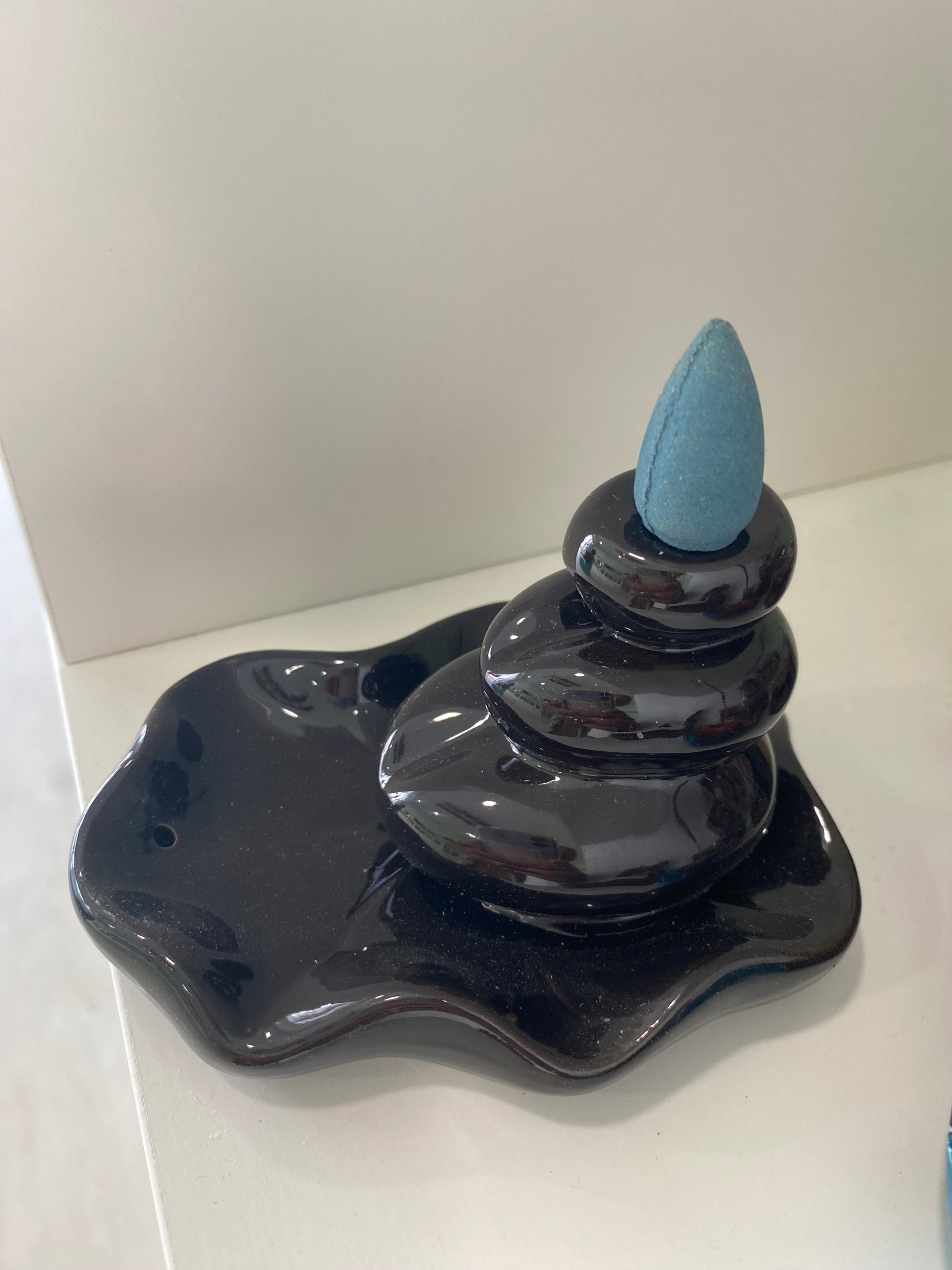 🌫️ ¿Cómo funciona? A diferencia de los quemadores tradicionales, este modelo utiliza conos de incienso especiales de flujo inverso. Al encenderlos, el humo —más denso que el aire— desciende en forma de cascada, deslizándose entre las piedras y acumulándose en la base como si fuera niebla sobre el agua.