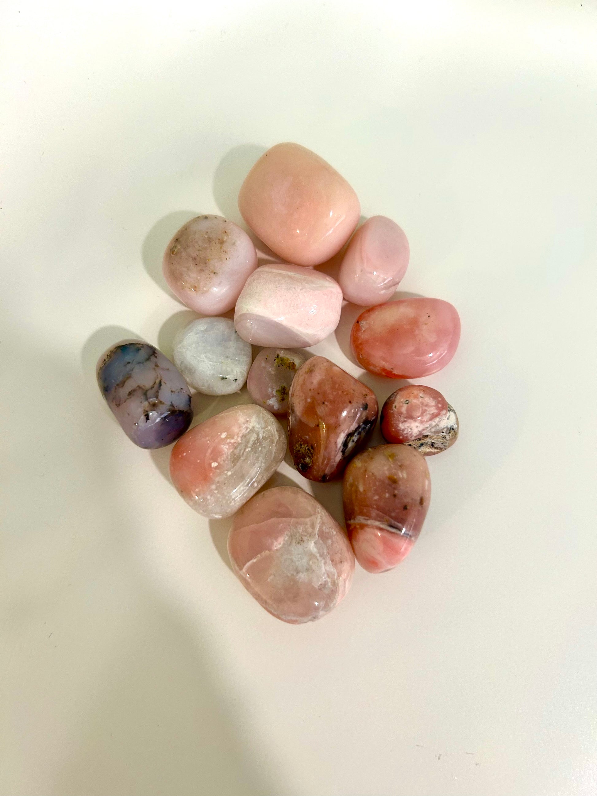 El rodado de ópalo rosa es una piedra pulida con un delicado tono rosado, apreciada por su energía calmante y su conexión con el amor y la serenidad.